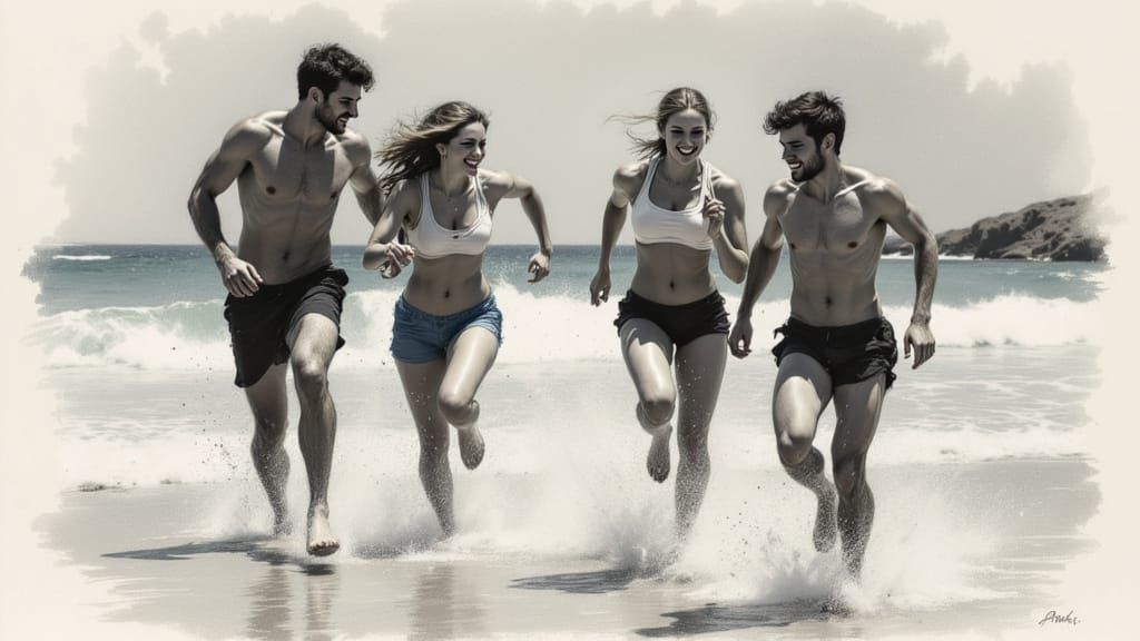 This image captures the carefree joy of young adults playing on a sun-kissed beach, their smiles and laughter radiating happiness in a bright and natural atmosphere, reminiscent of charcoal sketches from the Prudhon-Degas era.