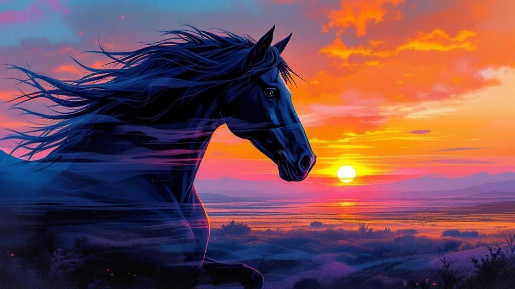 A striking picture of a black horse's head merged with a sunrise landscape. The image employs double exposure techniques and a colorful, iridescent palette, reminiscent of impressionism.