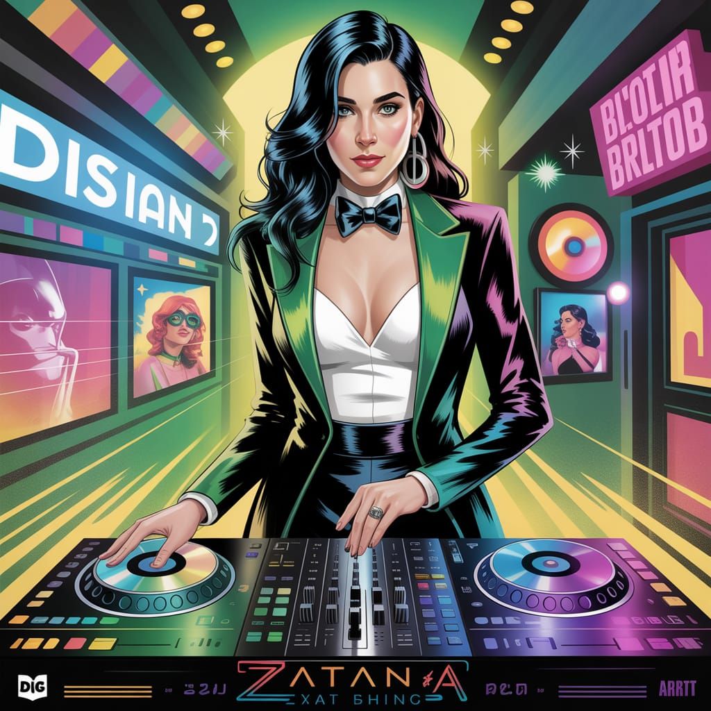 This image shows a glamorous Zatanna as a DJ in a music advertisement poster. The digital art features dynamic lighting, creating a shiny, glowing, and luminous effect.