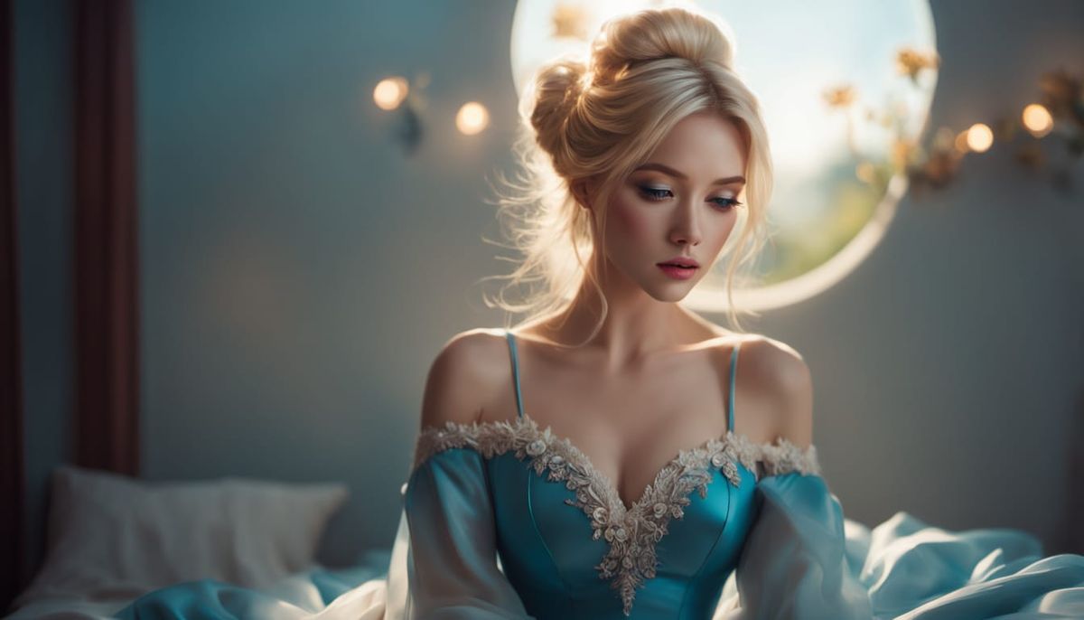 This image shows a young woman lying on a bed in soft, golden light. The scene is captured as hyper-realistic digital art with vibrant colors and a dreamy, romantic atmosphere.