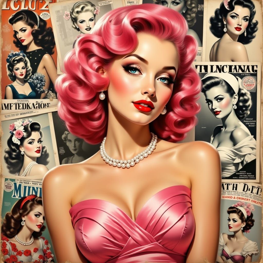 A glamorous 1950s pin-up portrait featuring a woman with voluminous pink curly hair, bold makeup, and pearl jewelry. Rendered with painterly realism and vivid colors.