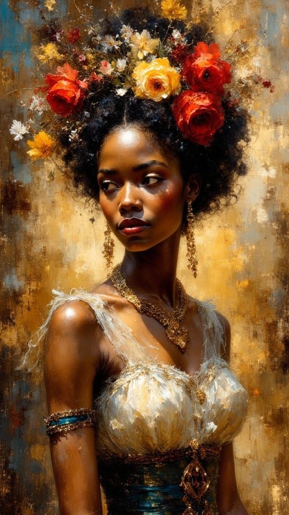 This image shows a portrait of a beautiful Nigerian woman from the 1800s. The image has an ethereal and painterly aesthetic.