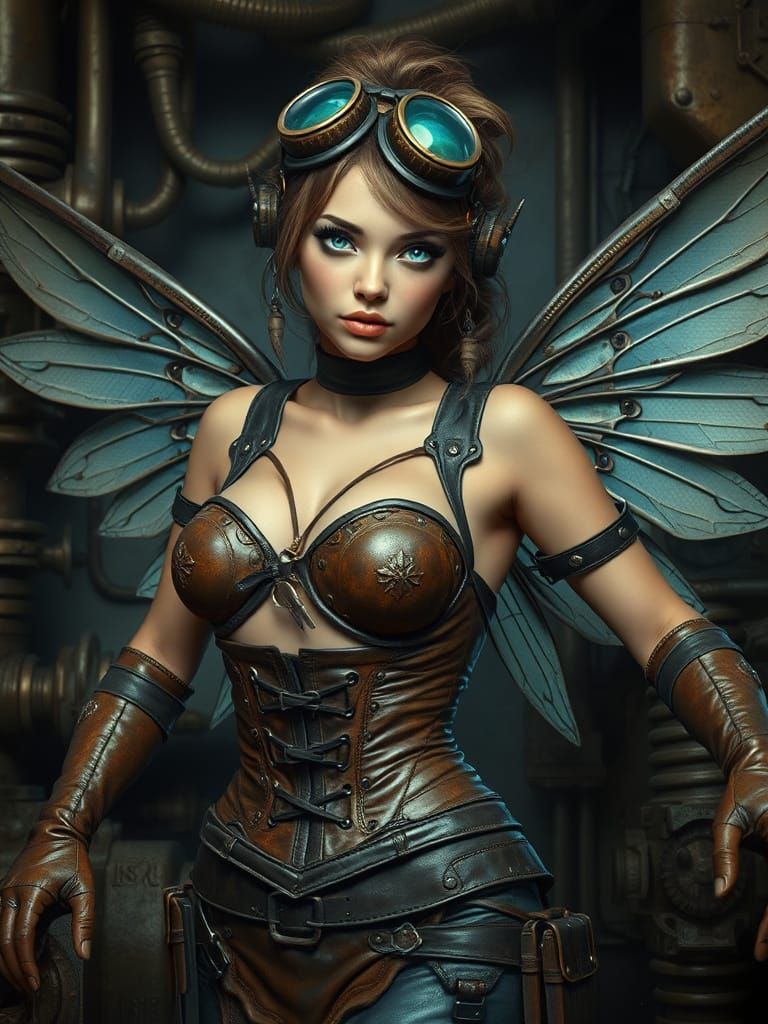 This image shows a steampunk fairy with metal wings and glowing eyes. She wears a leather corset and goggles, set against steam-powered machinery. The artwork blends Victorian and industrial styles.