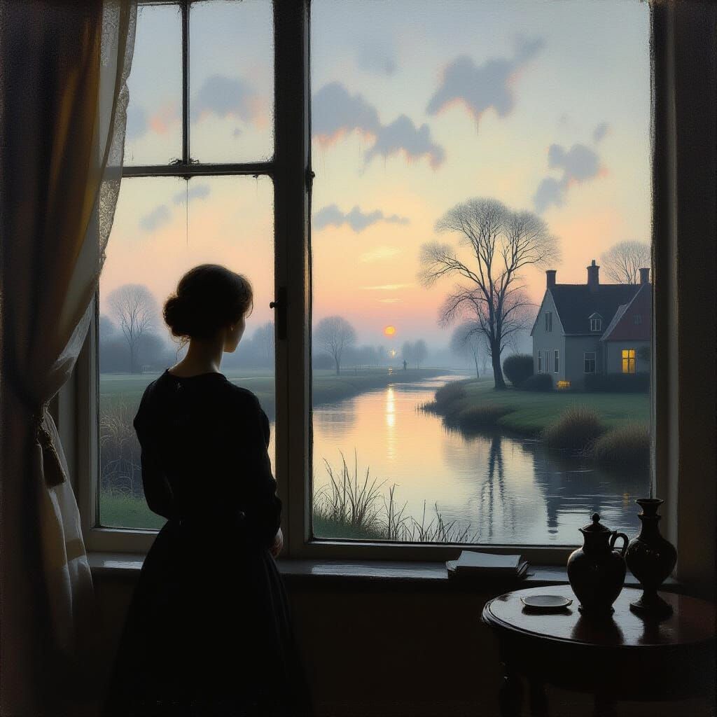This image shows a woman by a window, looking at a rainy dusk scene. The artwork uses classical oil painting techniques with subtle light and shadow, creating a melancholic atmosphere.
