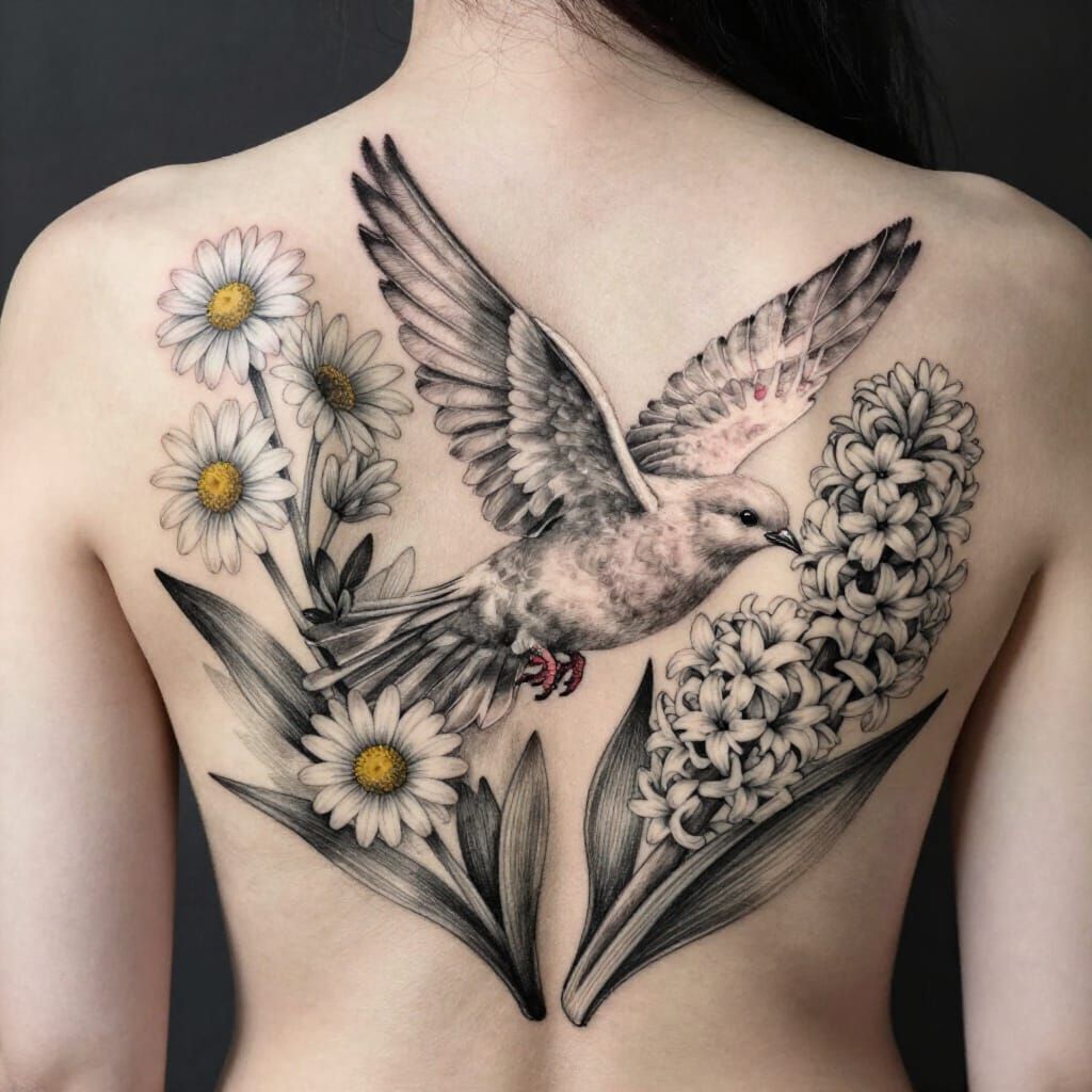 This image showcases a hyperdetailed charcoal drawing of a vibrant tattoo on a woman's back. It features a dove, daisies, and hyacinths in a realistic botanical style.