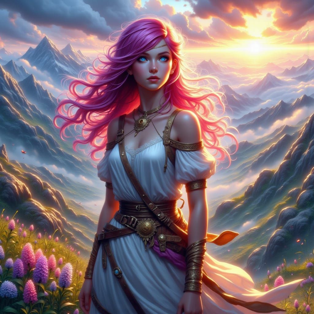 This hyperrealistic digital painting depicts Brunhilde with magenta hair and ornate jewelry on a mountain. Volumetric lighting and a vibrant tetradic color scheme enhance the epic scene.