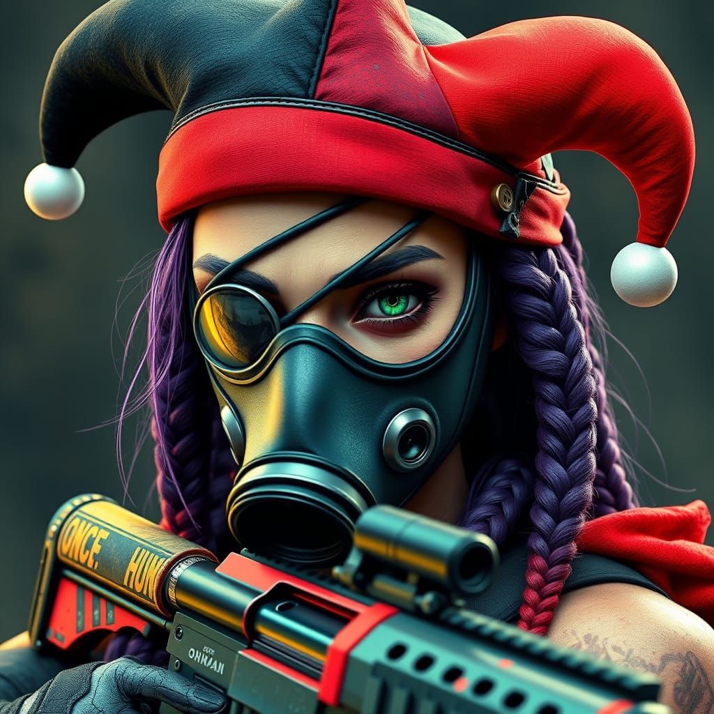 Inanna from ONCE HUMAN, wearing a gas mask, eyepatch, and purple braided hair, with piercing green eyes, dons a red and black jester hat, holding a rifle with trippy, swirling colors, in a realistic style with vibrant, spiritual aesthetics, reminiscent of Simon Stalenhag, Ash Thorp, and Noah Bradley's works.