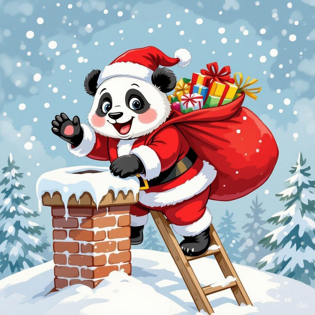 A watercolor image showing a cartoon panda dressed as Santa Claus delivering presents. The panda stands on a ladder and waves amidst a snowy, festive scene. The art style evokes classic children's book illustrations.
