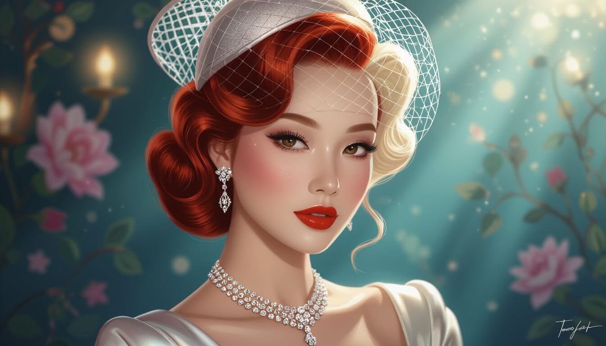 A photorealistic image of a sophisticated 22-year-old Chinese woman with a striking red bouffant hairstyle and diamond accessories. She gazes hypnotically, exuding allure. Features dramatic lighting and a vibrant splash art background.