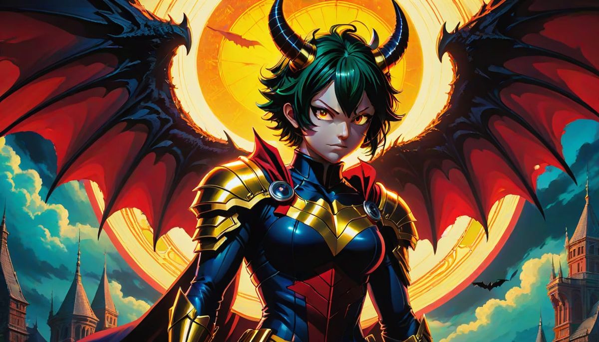 A female demon-like figure, a mature, pale skin, dark brown hair with pointed horns, swimsuit with golden armor-like scales on body and large bat-like wings, perched atop a cracked giant white eyeball with deep red pupil, sitting pose, intense expression. Dark, misty mountain landscape, ominous cloudy ...