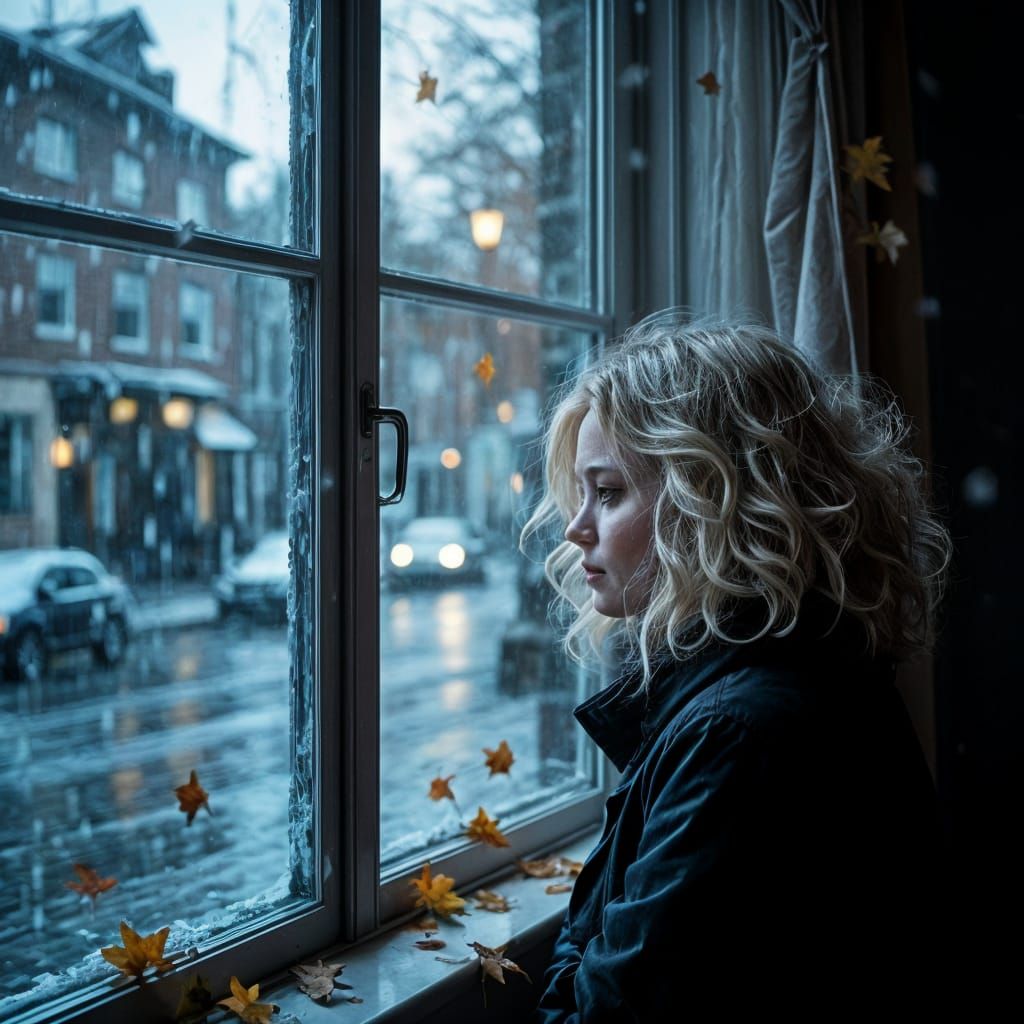 This image shows a woman with disheveled blonde hair in a room with an open window. Autumn leaves and raindrops are blown inside by strong winds and rain.