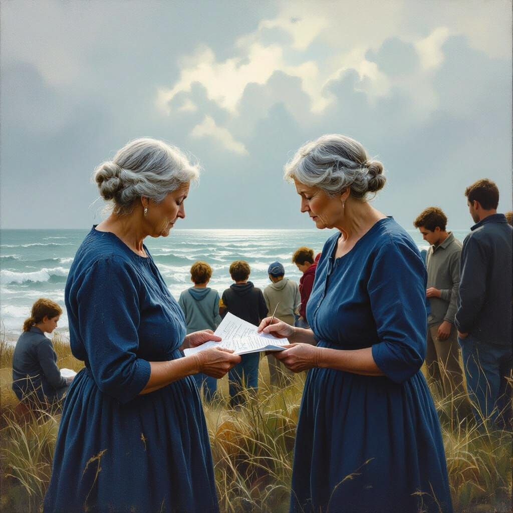 This image depicts an elderly woman filling out a form near the sea, shielded by a group of people. Rendered with dramatic realism and a muted coastal palette, it captures a moment of collective protection against the elements.