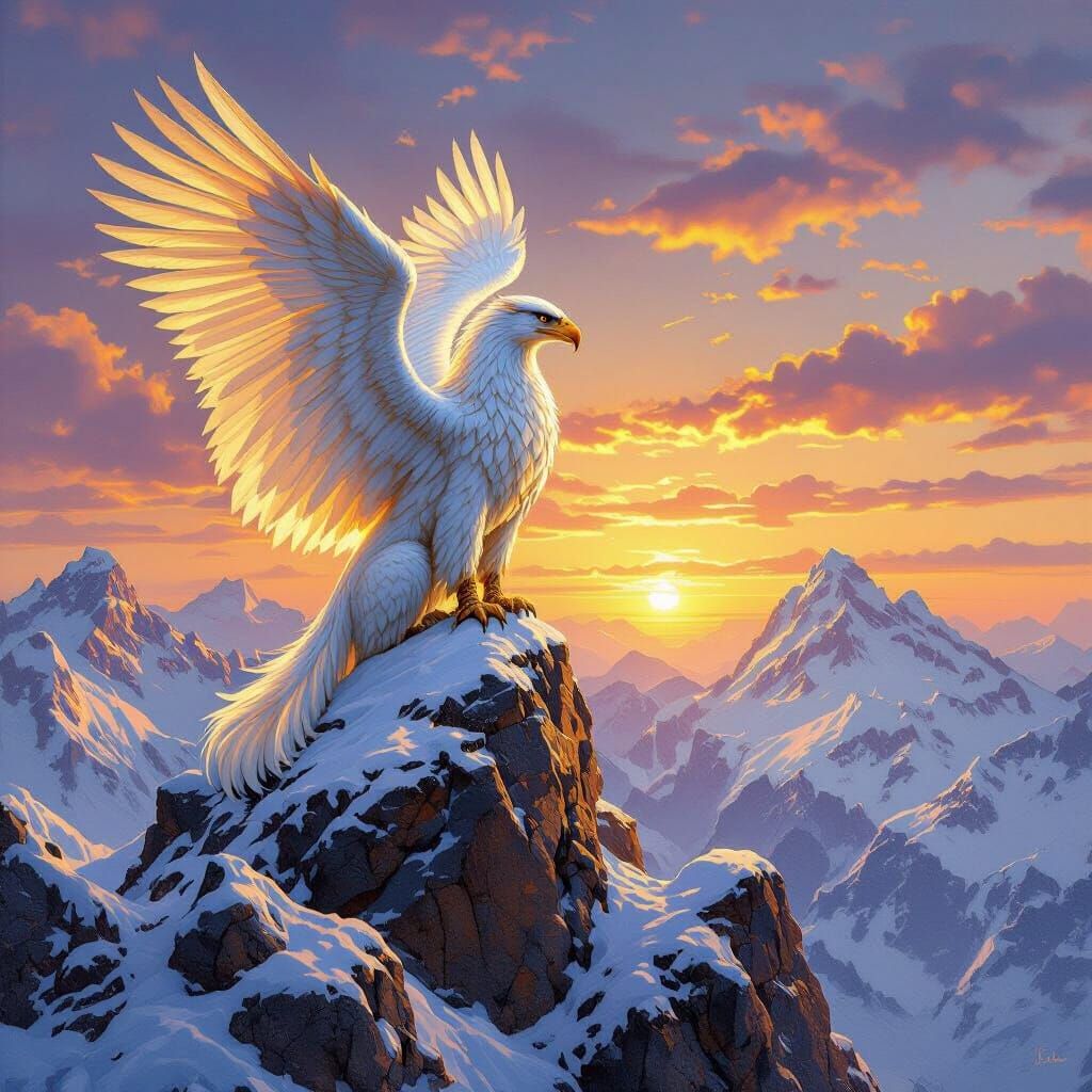 A striking picture of a golden griffin on a snowy mountain as the sun sets. The artwork features an oil painting aesthetic with dramatic lighting and rich textures.