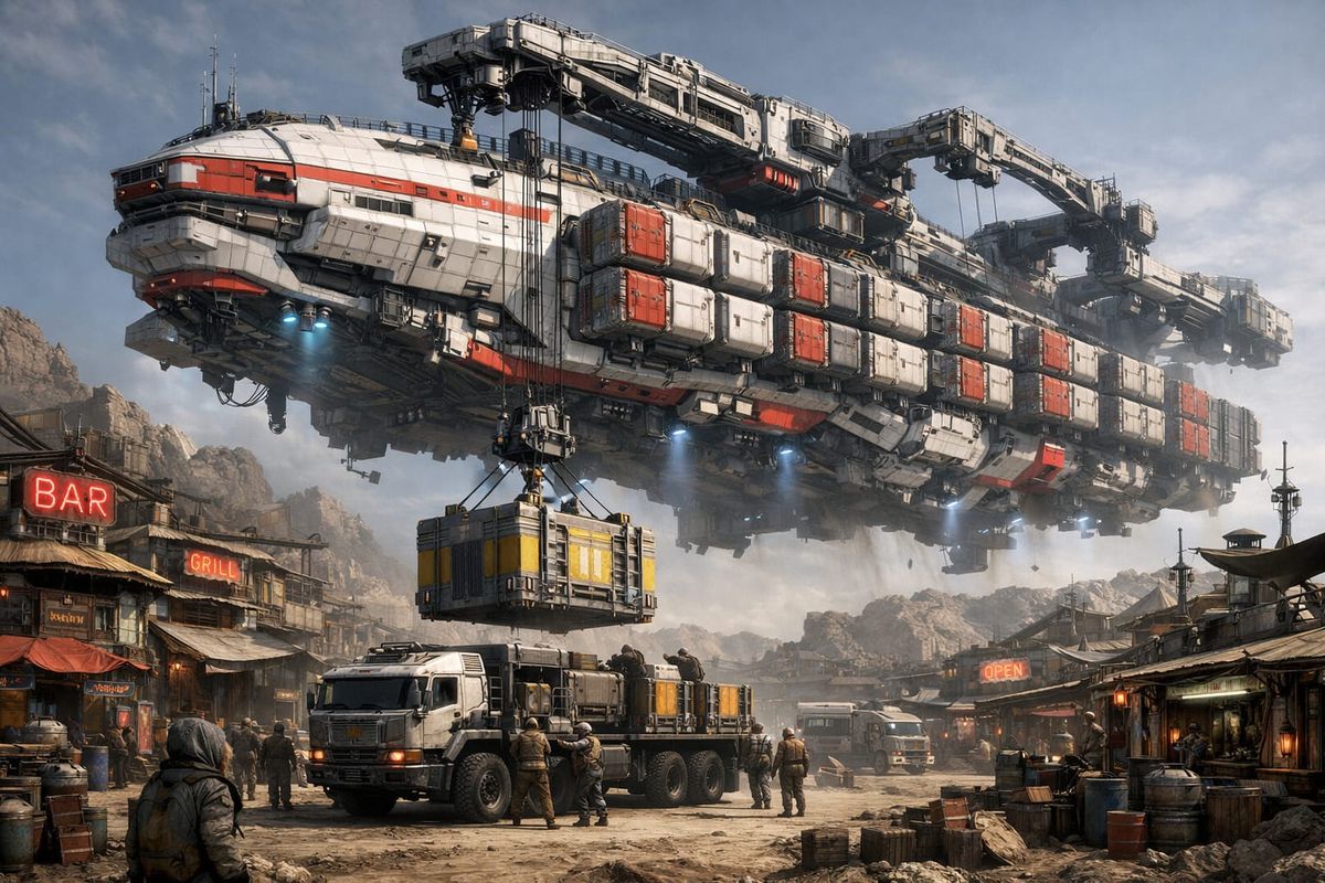 This 3D image depicts a massive, modular cargo spaceship hovering over a rugged outpost. Futuristic cranes lower supplies to waiting trucks below, highlighting heavy industrial and science fiction themes.