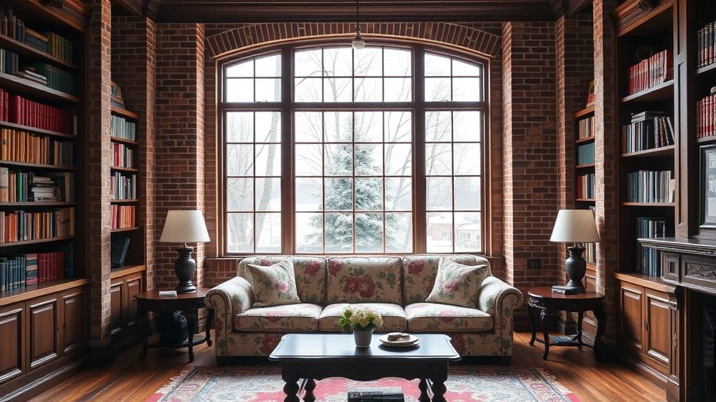 This image shows a Victorian-style library featuring floor-to-ceiling bookcases and a large bay window. Outside, snowy pine trees and snowdrops create a serene winter scene.
