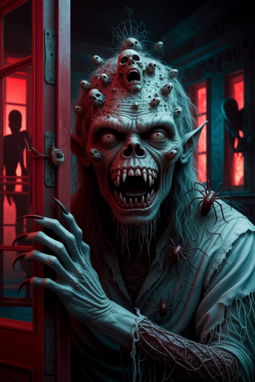 A chilling image of a horrific, towering demon in a dark bedroom. The creature's grotesque form is a fusion of mythic figures, enhanced by eerie red lighting and swarming insects.