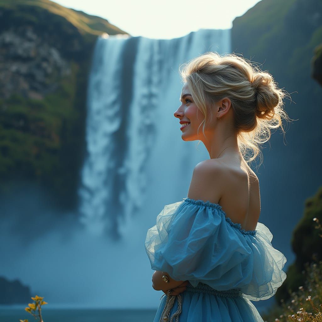 A realistic image of a blonde woman with an elegant updo, wearing a light blue dress. She smiles melancholically while admiring a sparkling waterfall, rendered with soft, warm light.