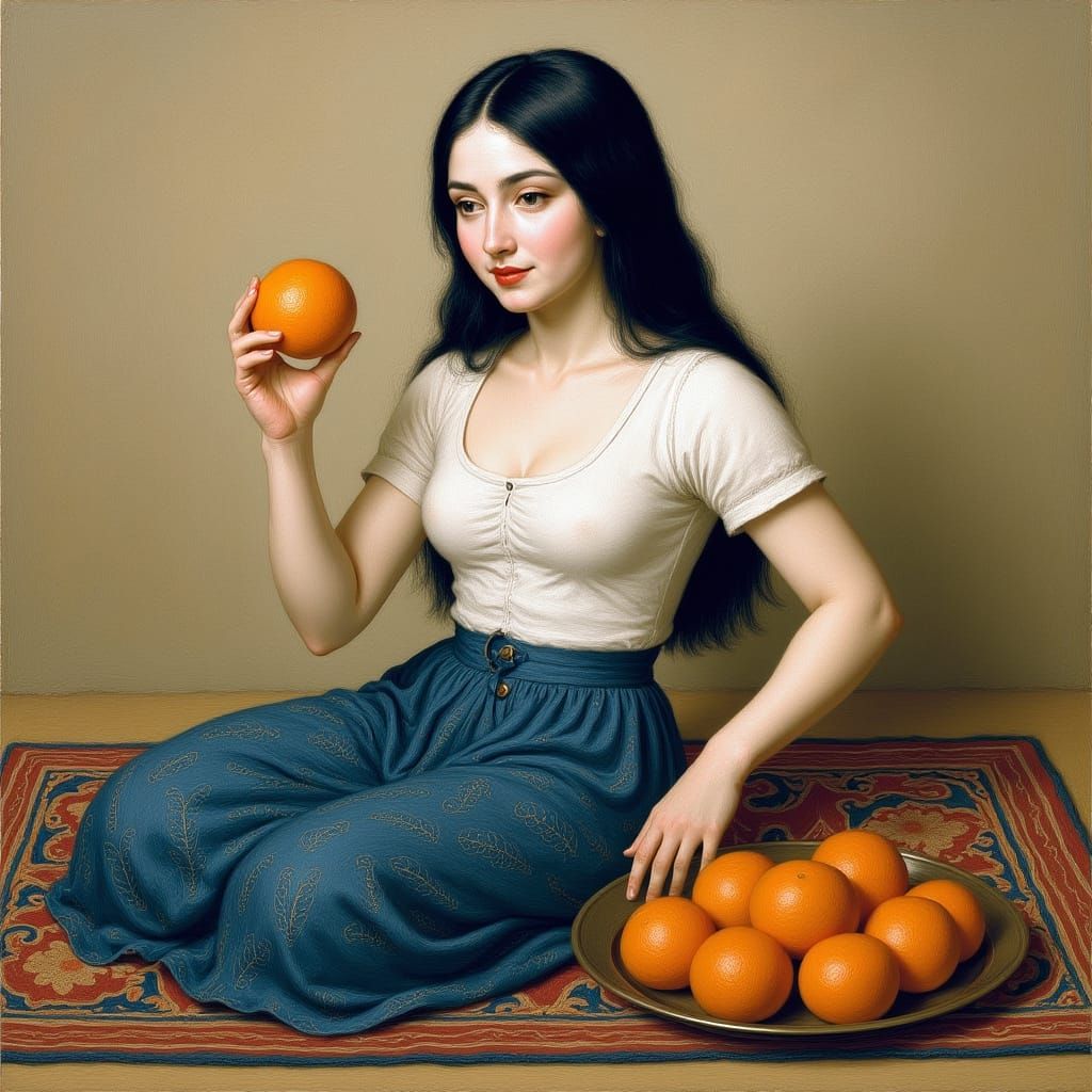 This image depicts a woman in a patterned skirt holding an orange, seated on a rug with more fruit nearby. Rendered in a detailed, muted 19th-century painting style with soft lighting.