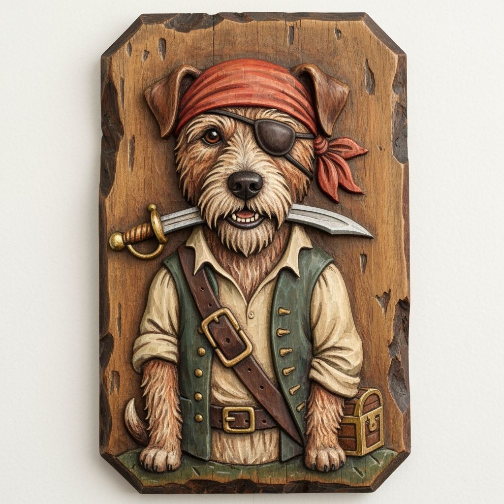 This image shows a whimsical wood carving of a pirate dog. The folk art plaque features rustic details, a distressed finish, and warm, earthy tones that evoke a sense of adventure.