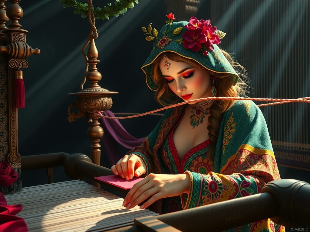 This image shows a beautiful Corso loom weaver crafting intricate patterns. The scene features vibrant sapphire, emerald, and ruby colors with dynamic lighting, rendered in a detailed digital painting style.