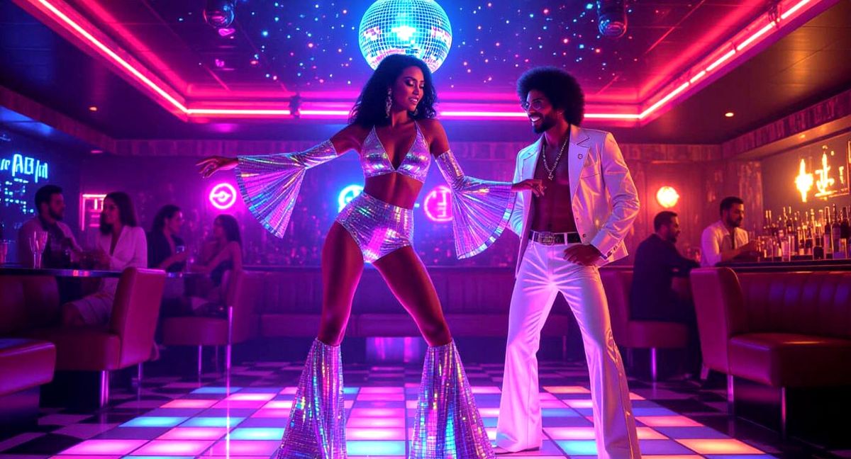 A futuristic woman wears a holographic one-piece bell bottoms attire it shimmers and is vibrant under the disco ball she is dancing with a ...