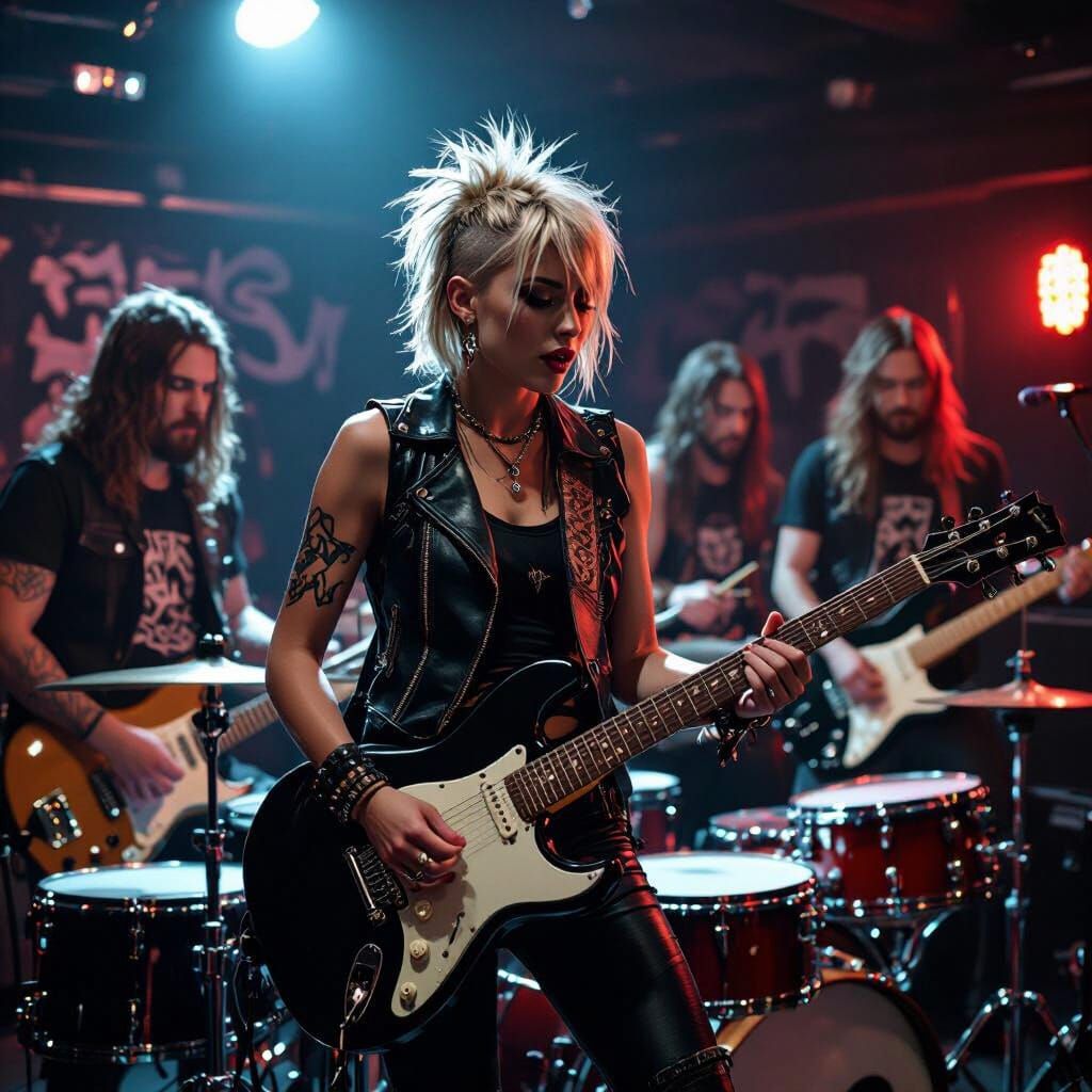 This image depicts a bald young woman in leather clothing performing in a punk band. Four men with long hair and beards play drums and electric guitars in a dark, textured rehearsal room with high-contrast lighting.