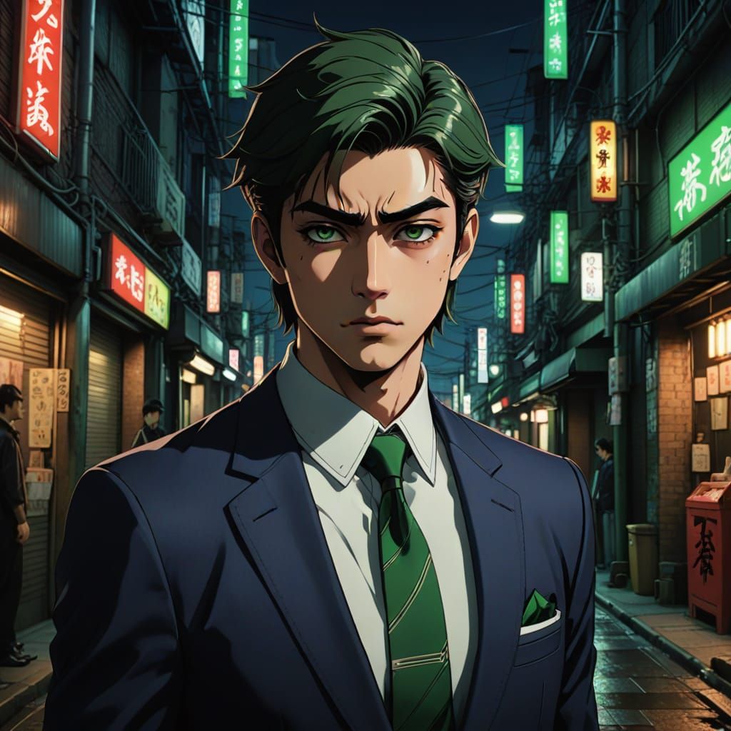 This image features a striking young man with piercing green eyes, set against a dimly lit alleyway backdrop with vibrant neon accents and intense shadows. The artwork is reminiscent of high-contrast anime styles, with intricate textures and strong lines.