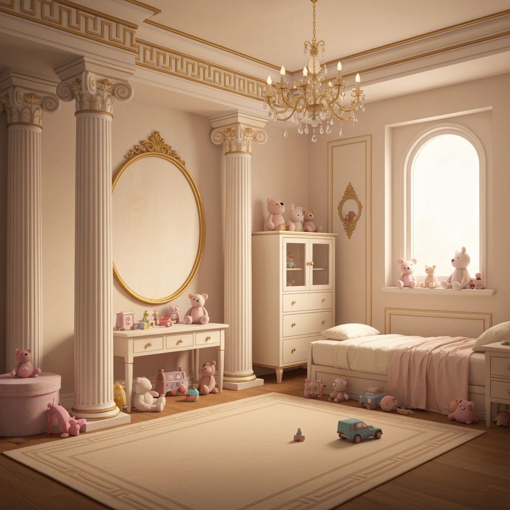 This image showcases a girl's bedroom in a Greek style. The room is filled with toys and features white columns and golden accents, creating a warm and inviting atmosphere as digital art.
