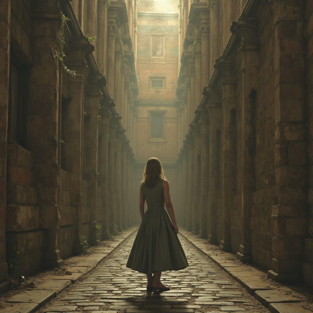 This image depicts a solitary woman in a vintage dress on a cobblestone street, looking up at an old library lit by gaslight. Rendered with textured encaustic strokes, it features muted colors for a melancholic feel.