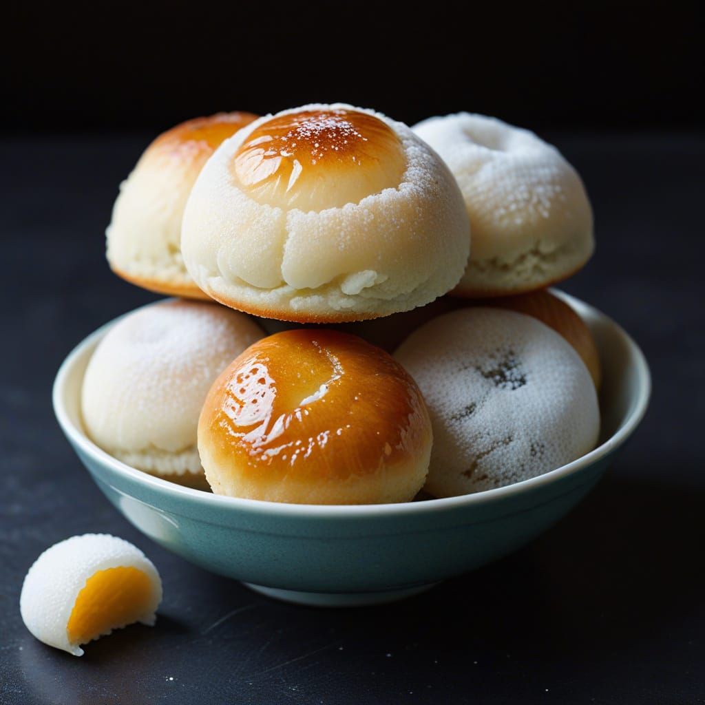 This image shows a classic still life of a mochi bun, presented in a simple and elegant vintage setting, highlighting its sweet and delicious appearance.