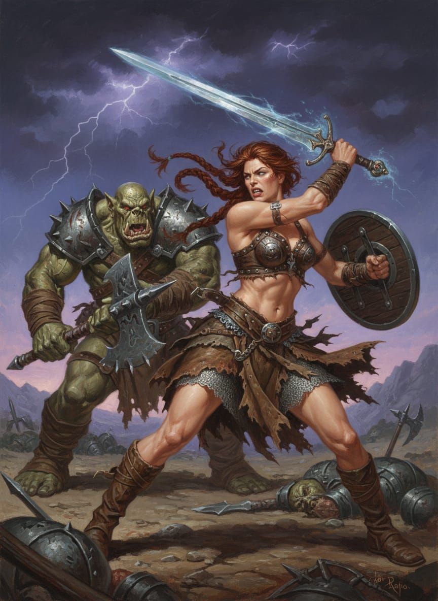 This image depicts a fierce shieldmaiden in leather attire, battling an Ork with a sword. The art style is reminiscent of dark fantasy illustration.