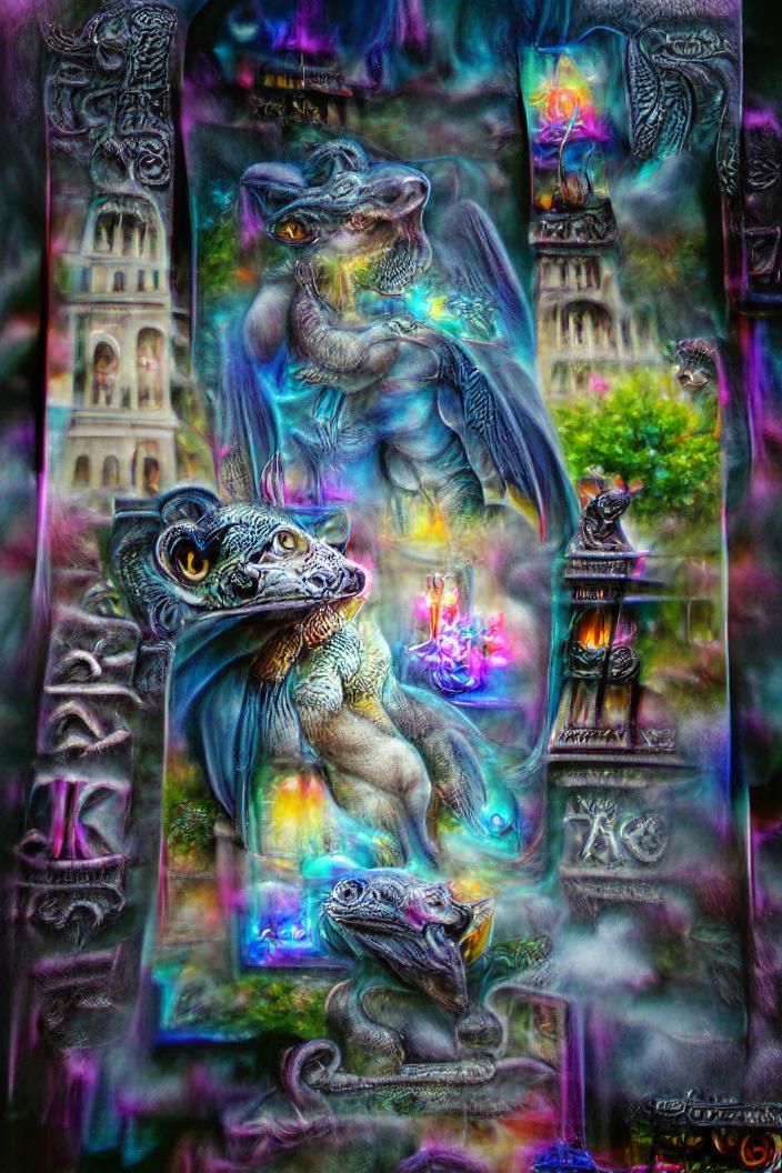 This image shows a magical gargoyle basilisk tarot card with runes in an 8k resolution holographic astral cosmic illustration. The image has a mixed media ethereal fantasy aesthetic.