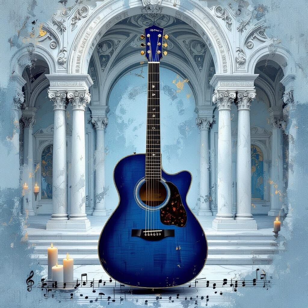 This image showcases a vibrant, deep-blue acoustic guitar with an aged finish. It's placed before a classical European building with intricate pillars and arches, rendered in a dreamlike, surreal style.