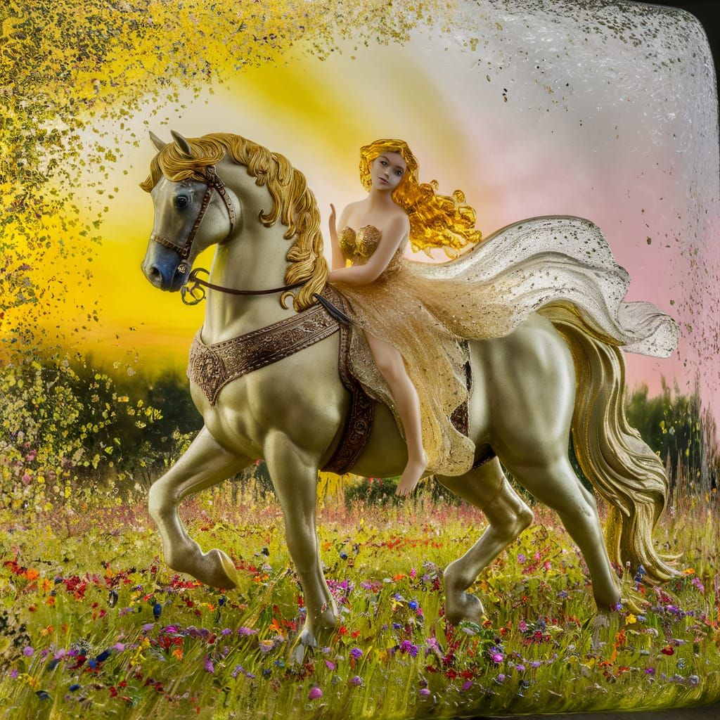 This image shows a beautiful young woman riding a horse through a golden meadow filled with wildflowers. The scene is rendered as shimmering glass art, with a fairy-tale magic aesthetic.