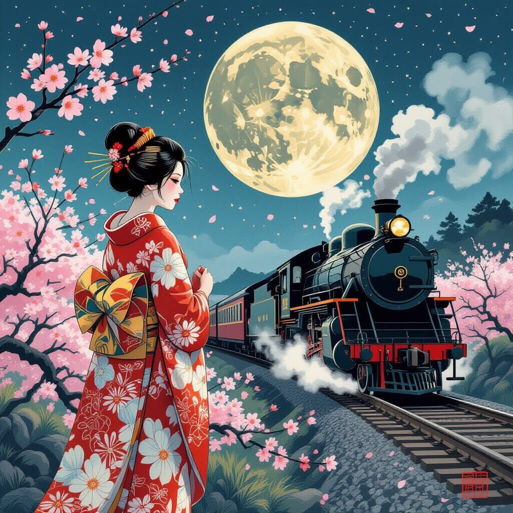 This image shows a woman in a kimono beneath a full moon, surrounded by cherry blossoms. A steam engine's screech echoes in the night, rendered in the style of traditional Ukiyo-e art.