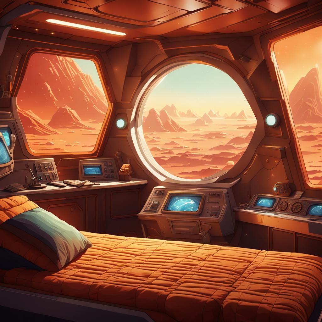 A detailed close-up of a spaceship sleeping berth with a view of Earth. The retro-futuristic scene features warm tones, soft lighting, and vintage-inspired tech in cinematic colors.
