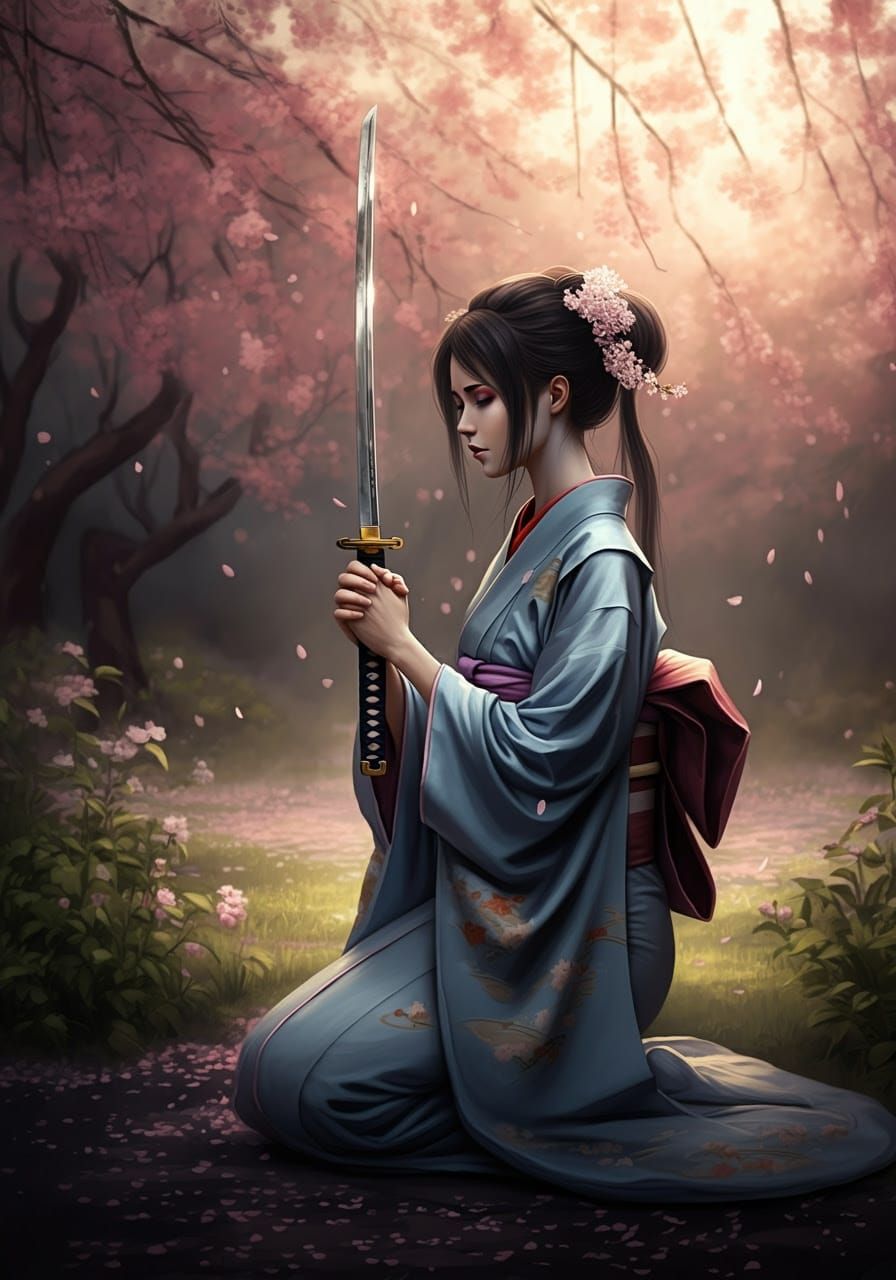 This image shows a tranquil Japanese Geisha kneeling in a garden filled with vibrant pink cherry blossoms, surrounded by delicate petals and lush greenery, as she offers a reverent prayer, her hands clasped around the hilt of a majestic broadsword, evoking the elegance of traditional Japanese art and cul...