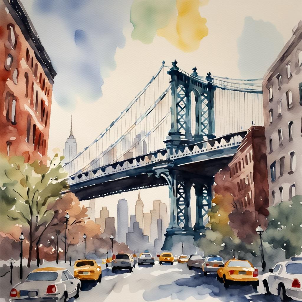 This image shows a watercolor painting of the New York City skyline, focusing on the Manhattan Bridge. The artwork employs light colors and a coarse brush technique.