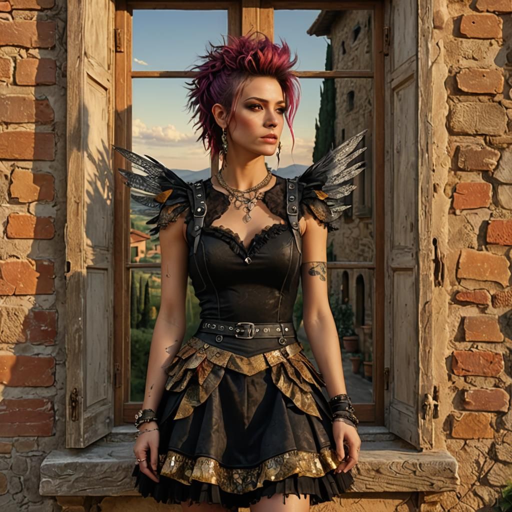 A digital artwork of a punk woman at a villa window overlooking Tuscany. She has feathered wings and wears a patchwork gown. Soft focus and golden lighting create a dreamy, intimate, ethereal aesthetic.