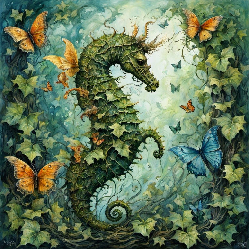 This image depicts a mystical forest scene with a seahorse surrounded by butterflies amidst an ivy-covered backdrop, evoking the essence of neo-expressionist and expressionist art styles.