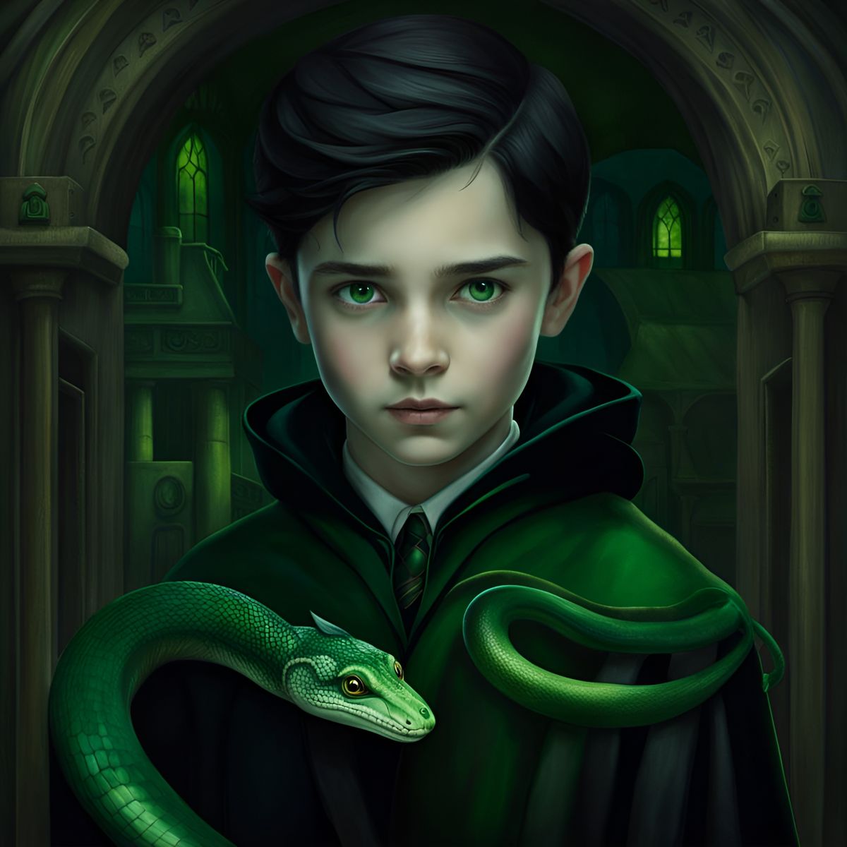 This image depicts a portrait of a young boy with dark hair wearing a black cloak and Hogwarts uniform. The background shows the Slytherin common room with a green snake collage in dim green light.