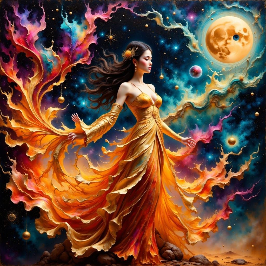Silhouette, Asian princess, breathtaking beauty, realistic, dress swirls and disappears into numerous nebulas, encaustic, impasto, gold leaf, orange, charcoal, magenta , crimson, beige, detailed background, cloisonne, Royo, Burlet, Bagshaw, Chevrier, Lou Xaz, Ferri, Kaluta, Minguez, Klimt <lora:hyperkraximalismus:1.0> ...