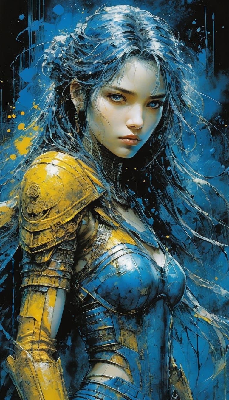 A vibrant abstract art piece featuring blue and yellow hues. The image showcases fine details and complementary colors, reminiscent of comic book art.