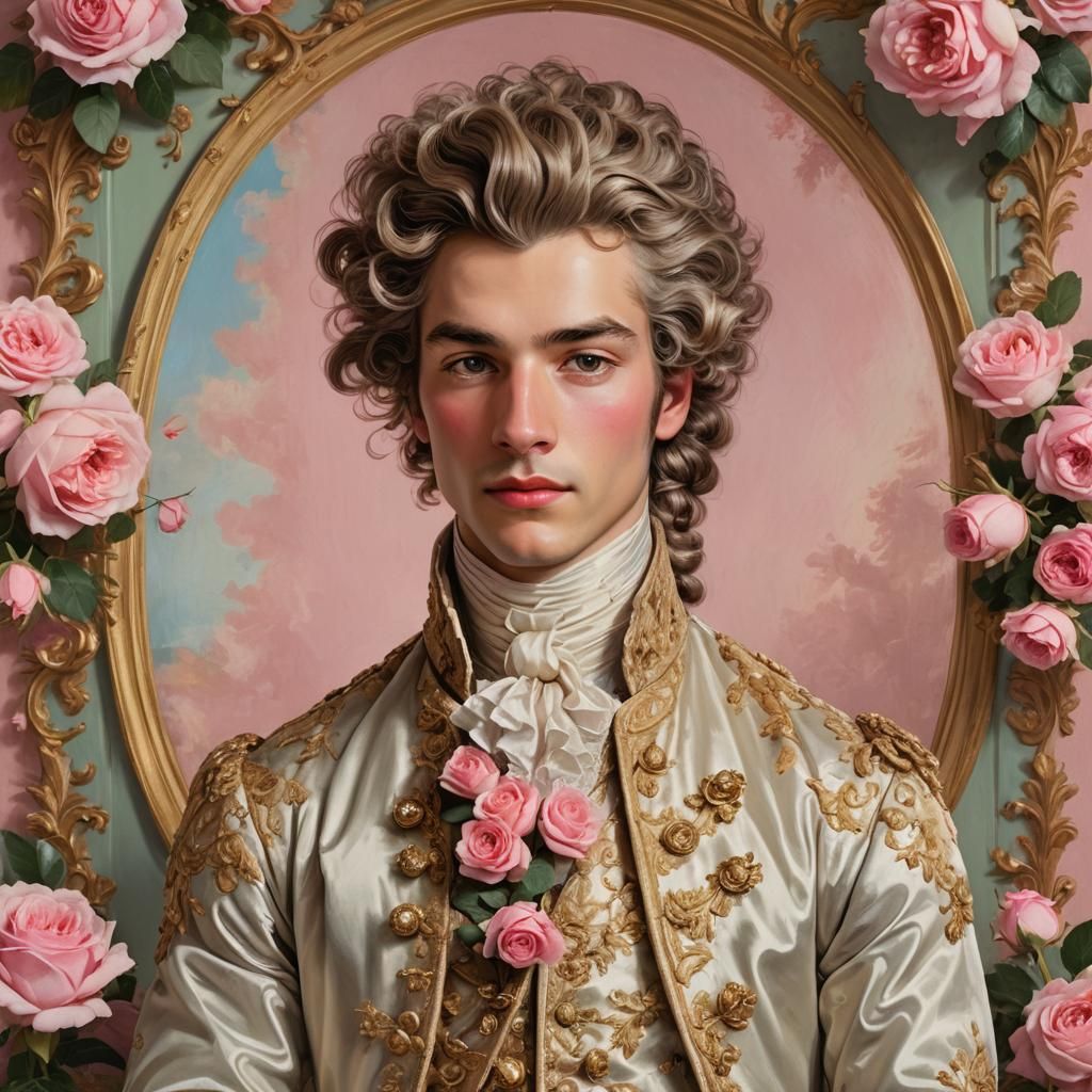 A head and shoulders portrait of a young aristocrat in 18th-century attire, surrounded by pink roses. The image features dynamic lighting and ornate details in a Rococo style.