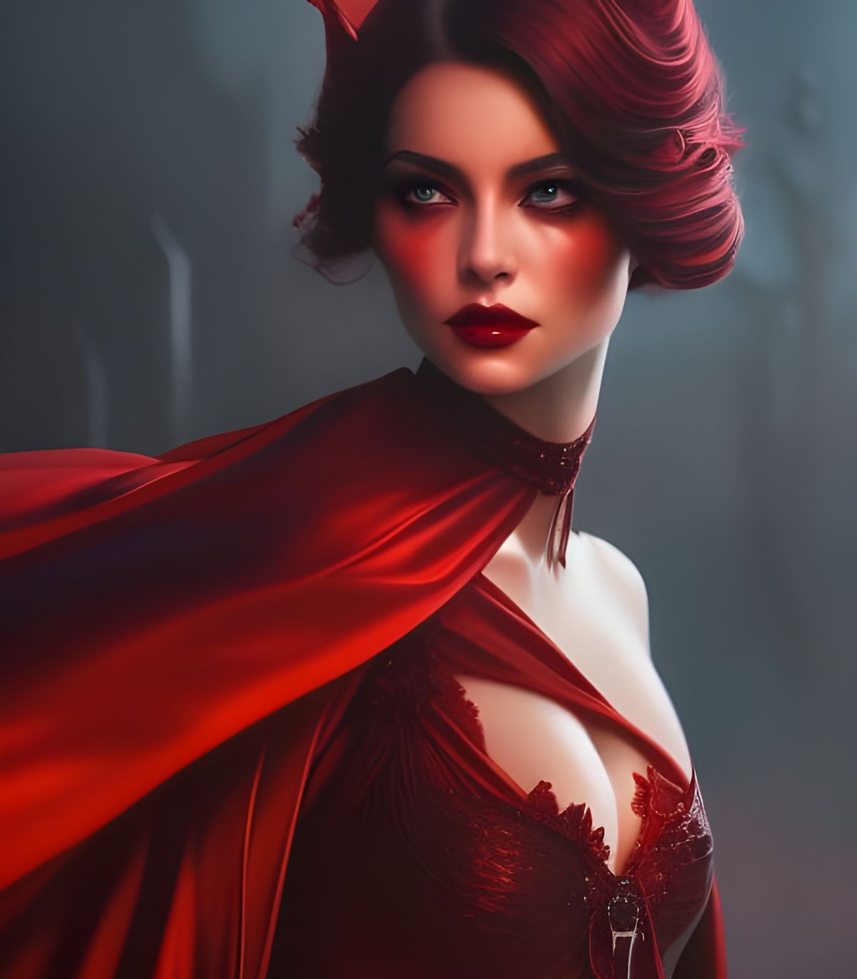 A striking picture of a beautiful woman in red. This digital painting features a dark, fantastical aesthetic with gouache textures, iridescent details, and a rich, complementary color palette.