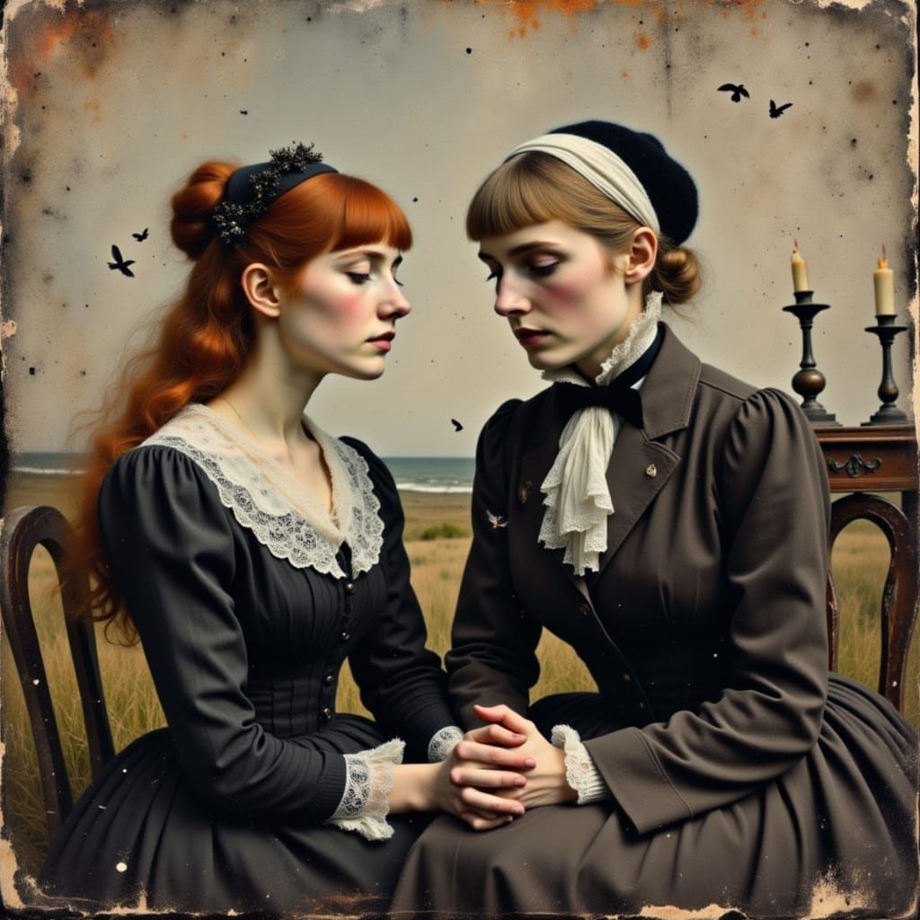 This image shows two women in a candlelit 1800s parlor. One comforts the other with an empathetic gaze, rendered with soft, earthy tones and expressive brushstrokes in an impressionistic style.