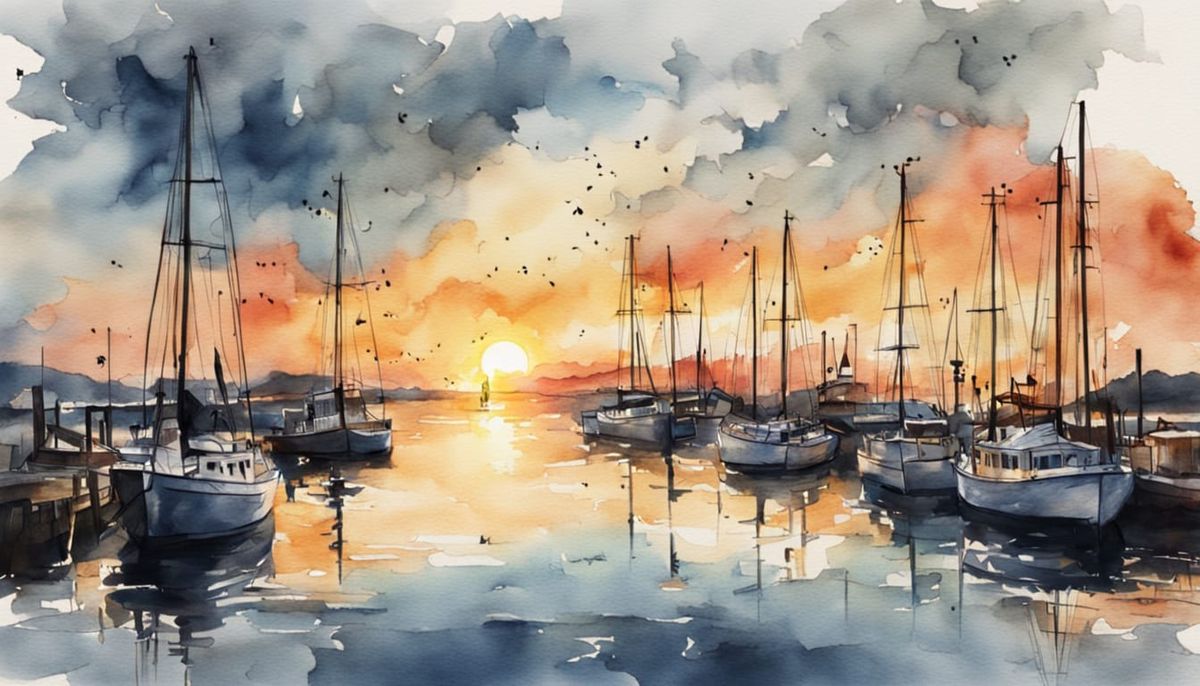 A vibrant watercolor painting capturing a sunset over a harbor. The loose, expressive brushstrokes and luminous colors create a dynamic and captivating scene.