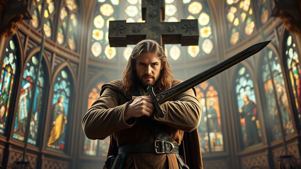 This image captures a dramatic moment from a fantasy world, as Aragorn draws his legendary sword Anduril in a breathtaking chapel setting. Rendered in a gritty, realistic style, reminiscent of cinematic masterpieces, with a warm golden color palette and subtle texture of 35mm film grain.