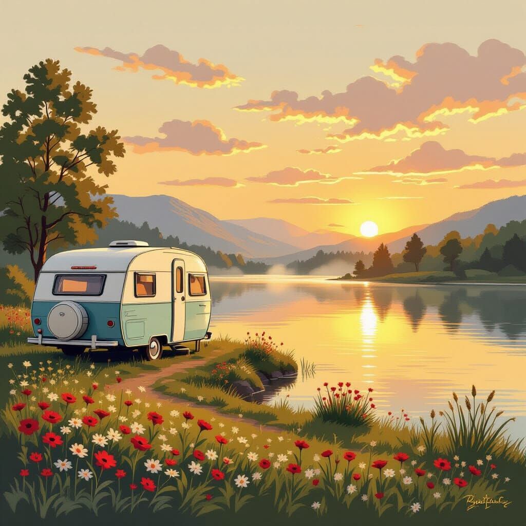 This image shows a peaceful, nostalgic scene of a vintage caravan by a tranquil lake at sunset. Wildflowers surround the caravan, with mist rising from the water in warm, golden light, rendered in a soft, painterly style.