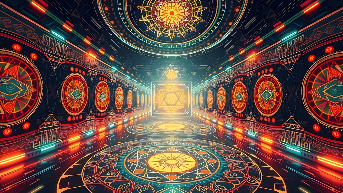 This image shows a network of interconnected rooms in space, rendered with ultra-high detail and sacred geometrical elements. The aesthetic is reminiscent of complex, high-quality CGI.